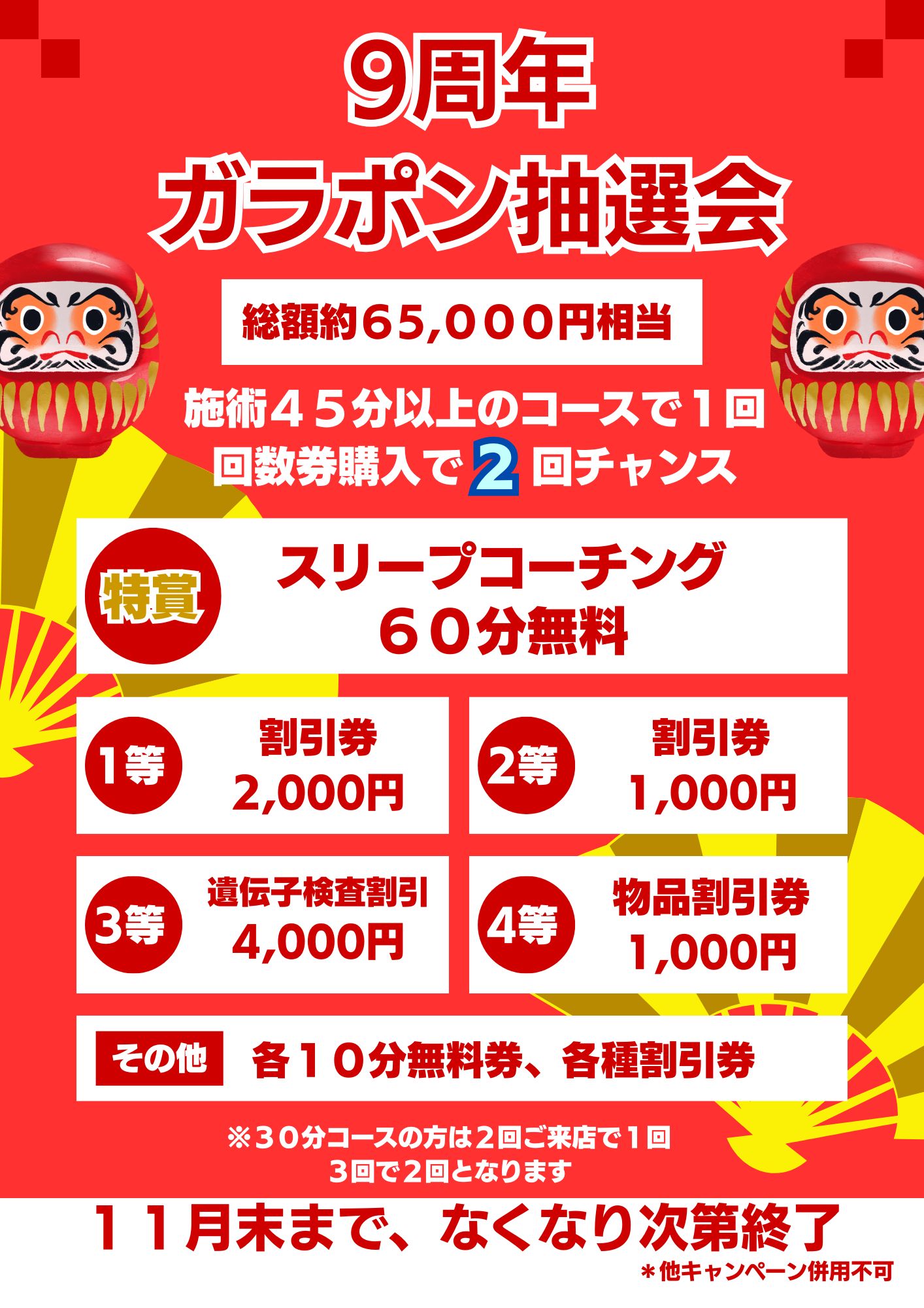 ・キャンペーン期間:11月1日〜11月30日まで ・景品がなくなり次第終了となります ・ご新規様でも再来の方でも ・ご来店1回につき1回チャレンジ ・回数券ご購入時は2回チャレンジ この機会にぜひ、体のケアと一緒に運試しも楽しんでください。皆さまのご来店をスタッフ一同、心よりお待ちしております!